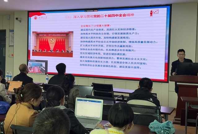 大会最后,万志昂副书记主讲本月教职工政治理论学习。学习内容紧扣四大核心板块:一是习近平总书记关于宗教中国化、“三农”工作的重要讲话和指示批示精神;二是习近平总书记关于中华民族共同体建设的重要文章,解读中华民族共同体形成与发展的历史必然;三是党的二十届四中全会精神,重点解读全会审议通过的“十五五”规划建议及12项重大部署,明确新时代教育工作者的使命担当;四是《中国共产党思想政治工作条例》核心内容,结合学院实际,强调要将思想政治工作贯穿教育教学全过程,为学院发展提供坚强思想保证。
