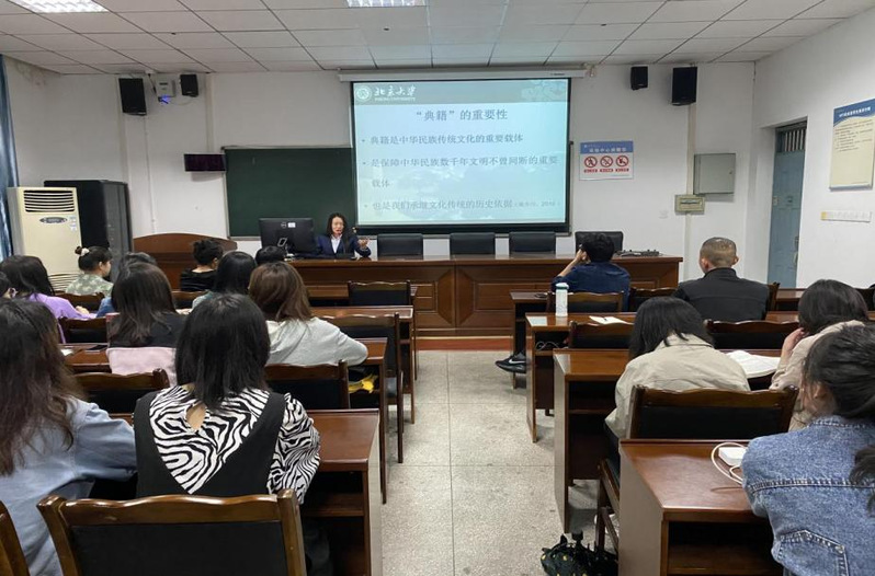 李华英博士以“新时期中国文化典籍英译策略研究—以《礼记》篇名的英译为例”为题,介绍了自己对于典籍翻译的见解。首先,李博士为大家分享了何为“典籍”,从汉字的“形”生动形象地讲解了“典”和“藉”的含义—1912年之前,用中文写成的,系统的,有价值的文献资料;接下来,李博士介绍了典籍翻译对于中国文化走出去的重要性,他指出,近年来,典籍外译项目在学界饱受瞩目,当代研究生应不断增强文化自信,学以致用,弘扬和传承中华传统文化;然后,李博士结合其《礼记》题目的翻译,从音韵学的角度阐释分析自己对于该篇名的翻译策略与技巧的选择。